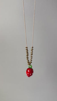 A handmade glass strawberry charm hangs sweetly from a nylon cord, sprinkled with tiny golden hematite beads for that just-right glow. The cord adjusts with ease — wear it high like a choker or let it swing low with effortless charm. Light, durable, and ready to sweeten your every move.